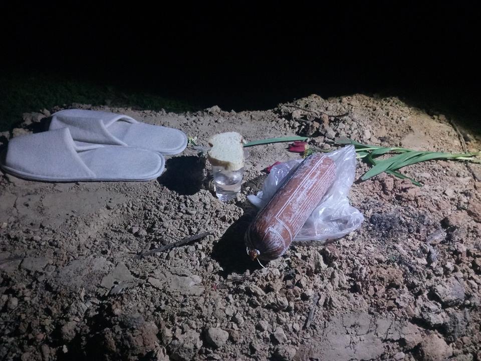 Однако на одной “могиле” активисты не остановились и принесли туда еще белые тапочки, палку колбасы, два тюльпана и поставили рюмку с прозрачной жидкостью, а сверху положили ломтик хлеба.