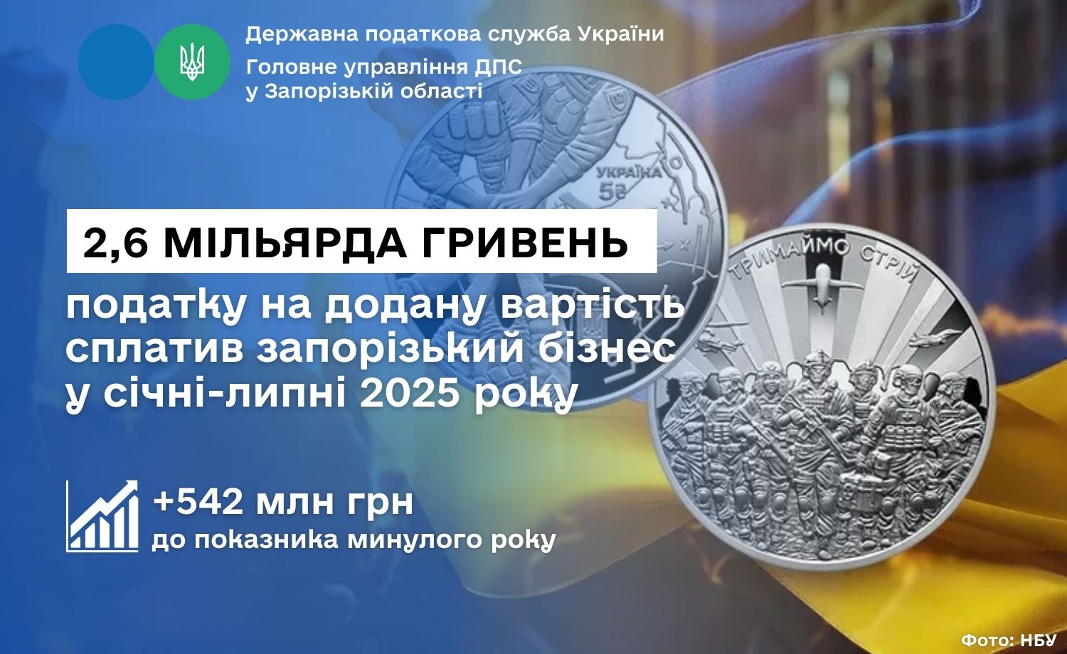 У січні-липні 2025 року представники бізнесу Запорізької області спрямували до державного бюджету 2 мільярди 584 мільйони гривень податку на додану вартість. Як повідомила начальниця Головного управління ДПС у Запорізькій області Оксана Федорова, ця сума перевищує минулорічні надходження на 542 мільйони гривень або 26%.