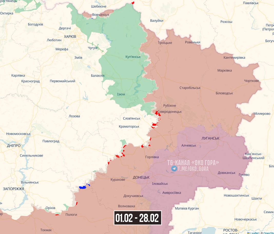 За даним каналу Око Гора, що вже тривалий час щомісяця оцінює зміни на фронті, зза лютий 2026 року маємо наступні цифри: