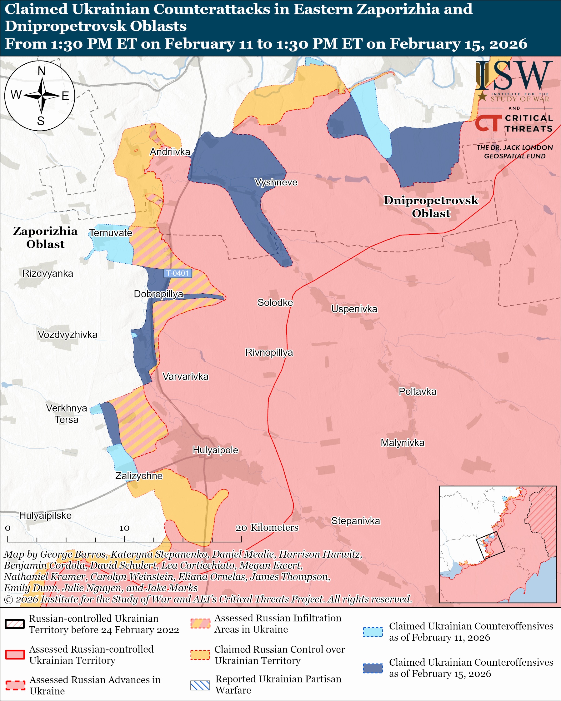 Водночас за оцінками ISW, українські війська звільнили близько 91,1 квадратних кілометрів в Україні між 11 та 15 лютого. ISW оцінює, що російські війська захопили приблизно 28,3 квадратних кілометрів в Україні за той самий період. Українські війська загалом отримали більше території, ніж російські війська, між 11 та 15 лютого, при цьому чиста зміна склала близько 62,8 квадратних кілометрів для України на театрі військових дій.