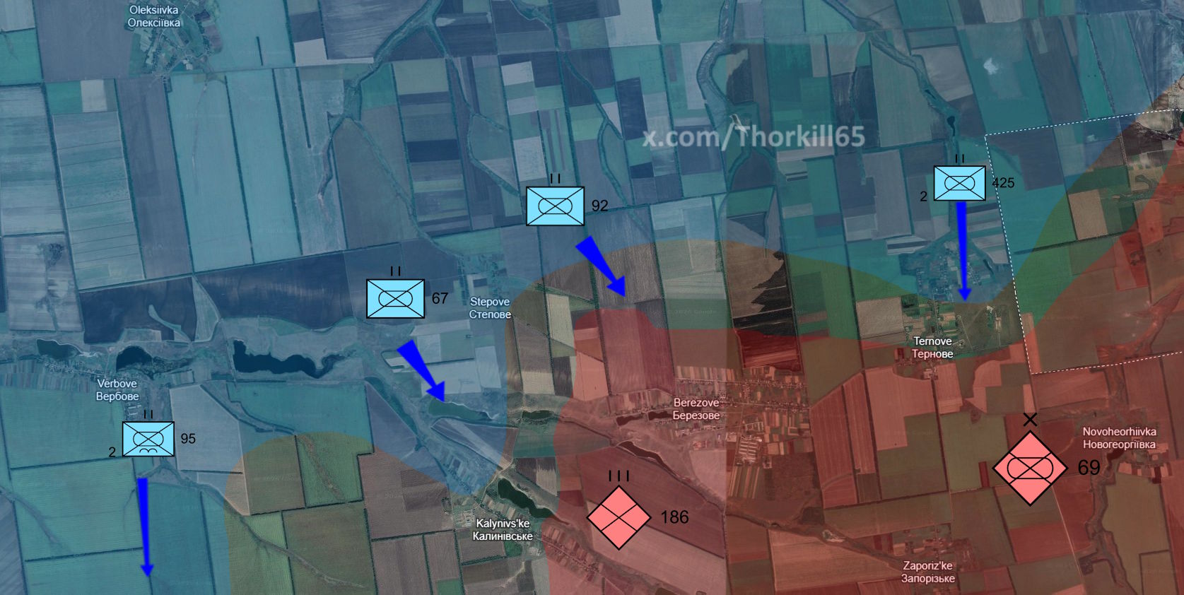 Паралельно штурмові підрозділи ЗСУ завдають ударів із заходу — з плацдарму на правому березі річки Гайчур у напрямку Злагоди та Солодкого – це вже ближче до Гуляйполя.