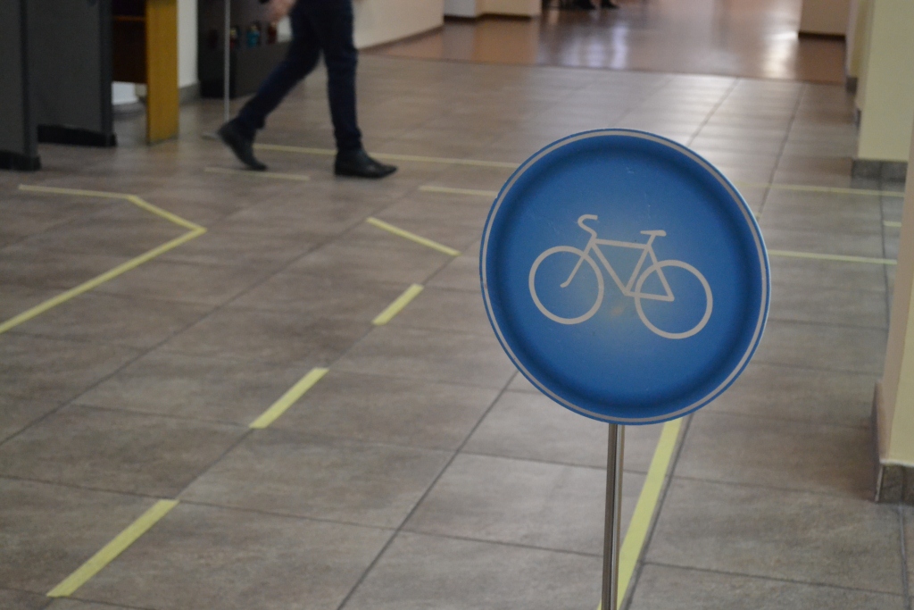 Для того чтобы заявить о себе и наглядно показать, как должны выглядеть велодорожки, запорожские велосипедисты при помощи скотча создали пример прямо в фойе горсовета, перед пунктом охраны.