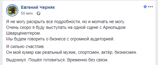 “Я сильно счастлив. Он мой кумир как реальный мужик, спортсмен, актёр, бизнесмен. Выдохнул. Пошёл готовиться. Временно без связи”, – написал Черняк