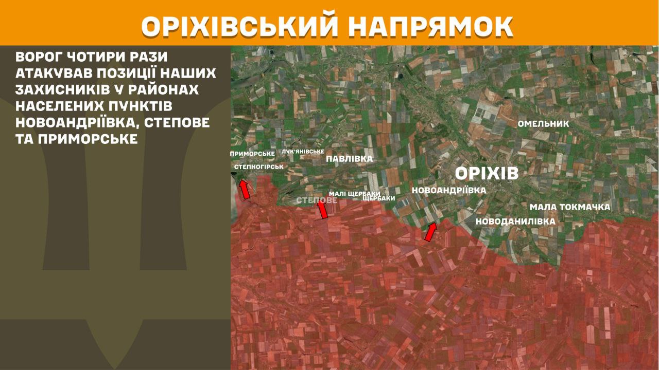 Не менш гаряче було й на Оріхівському напрямку. Тут російські сили чотири рази намагалися атакувати позиції Сил оборони поблизу Новоандріївки, Степового і Приморського. Усі ворожі спроби були впевнено зупинені українськими захисниками.