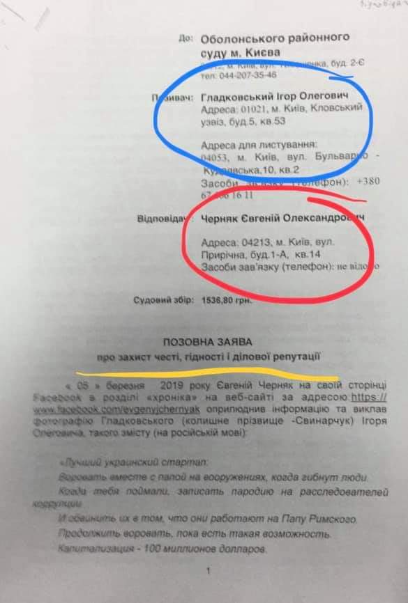 Сын экс-заместителя секретаря СНБО Олега Гладковского подал в суд на запорожского бизнесмена Евгения Черняка связи с его публикацией о коррупции в Укроборонпроме.