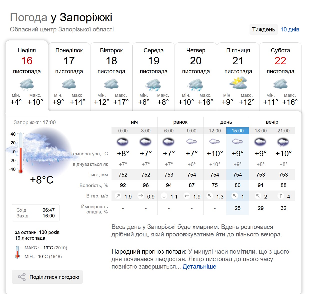 Субота знову принесе вологу погоду та можливий вечірній дощ. Температура становитиме від +11°C до +16°C. Загалом тиждень у Запоріжжі мине під щільною хмарністю, з регулярними опадами та підвищеною вологістю, попри відносно м’які для листопада температури.