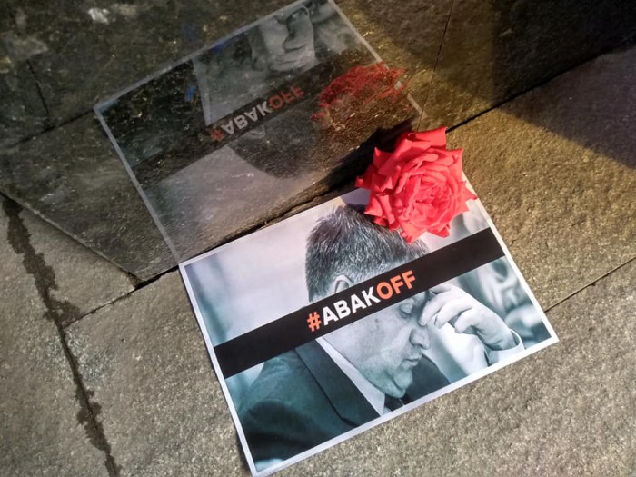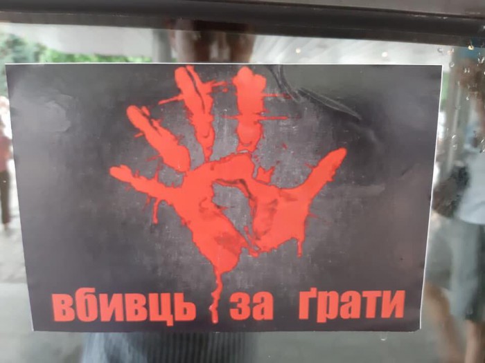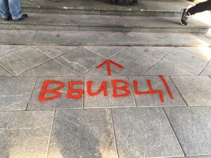 Неравнодушные горожане изрисовали все крыльцо надписями “Вбивці” и под конец акции зажгли дымовые шашки.
