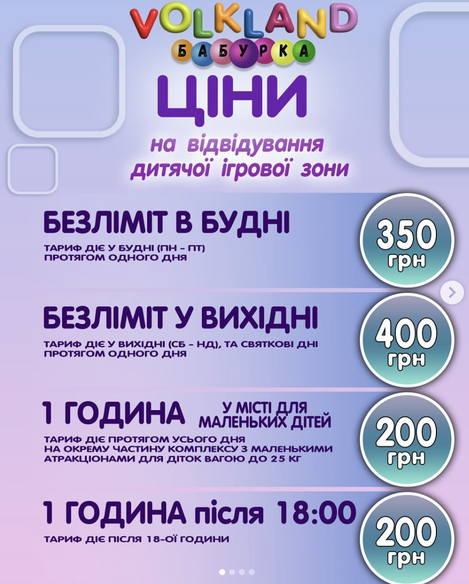 - 200 грн — за годину у зоні для малюків (до 25 кг);