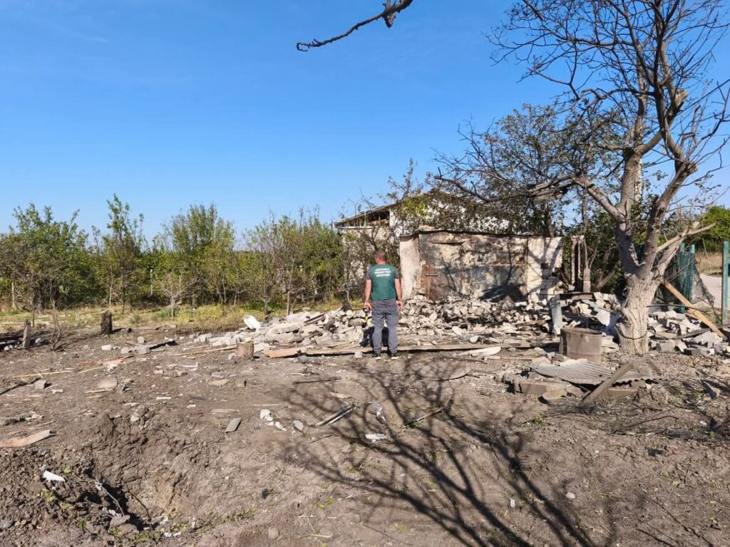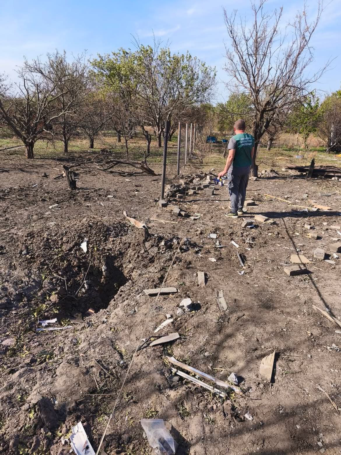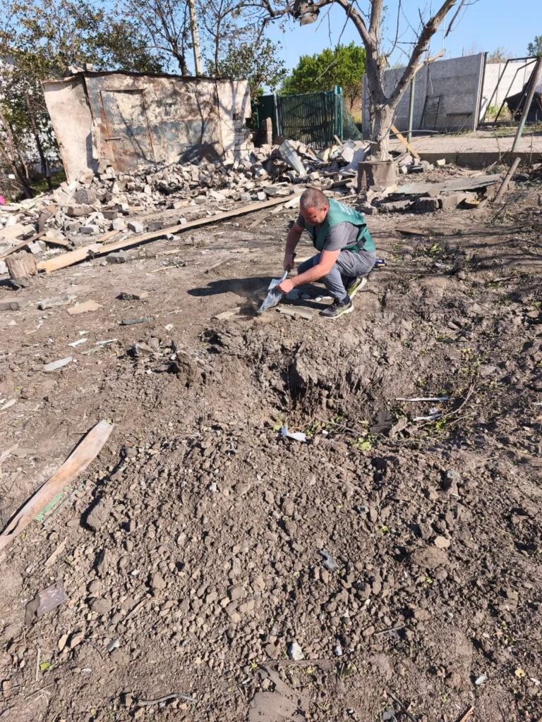 На місці виявили вирву об’ємом майже 6 м³. Інспектори відібрали зразки ґрунту для лабораторних досліджень, щоб визначити рівень його забруднення після ворожої атаки.