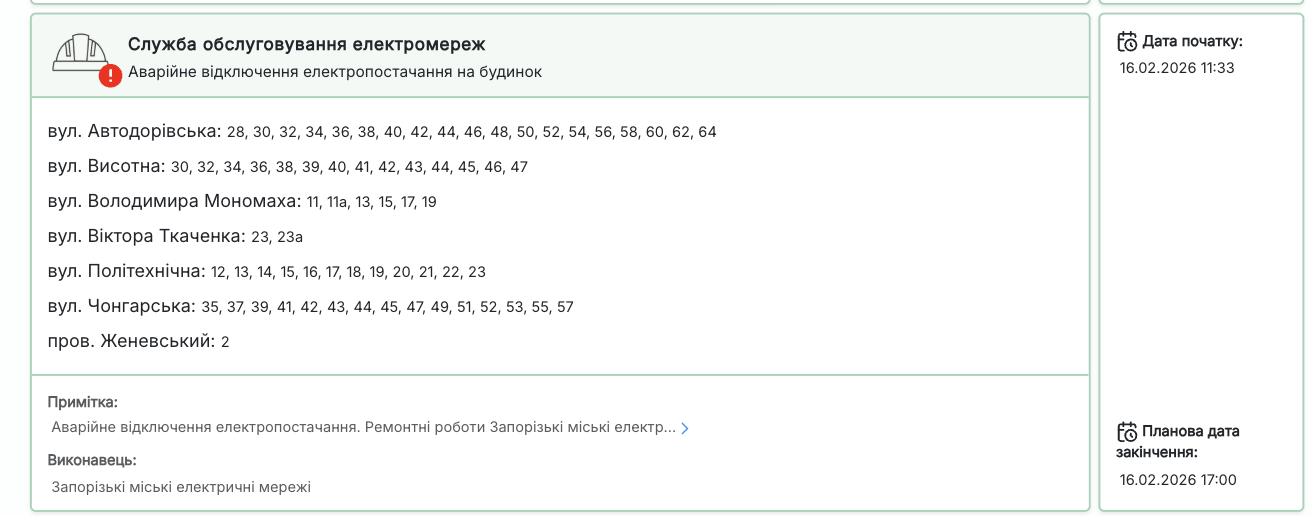 У понеділок, 16 лютого, в Запоріжжі зафіксовано аварійні відключення електропостачання. За інформацією служби обслуговування електромереж, причиною стали пошкодження електрообладнання. Ремонтні бригади вже працюють на місцях.