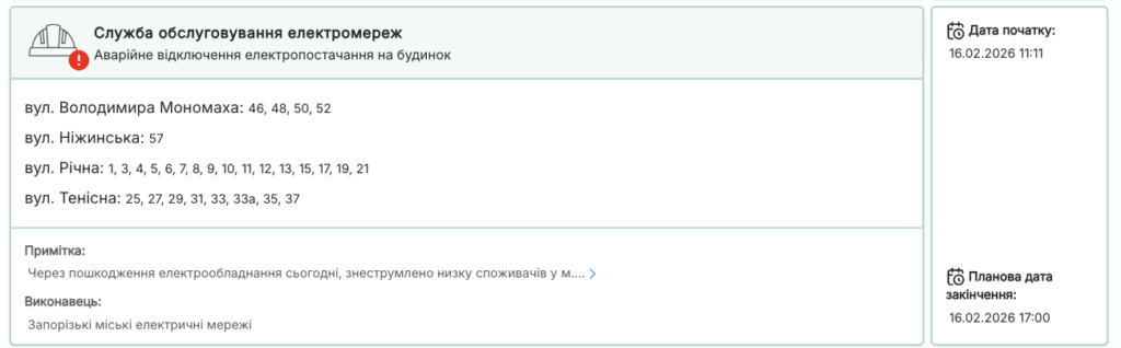 🔧 Плановий час відновлення електропостачання — до 17:00.
