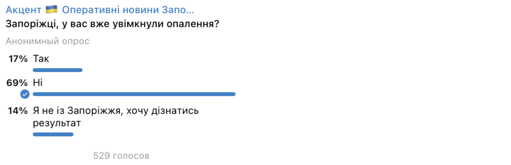 6 листопада редакція Telegram-каналу «Акцент. Оперативні новини Запоріжжя та України» провела анонімне опитування серед підписників, щоб з’ясувати, чи отримали запоріжці тепло у своїх оселях.