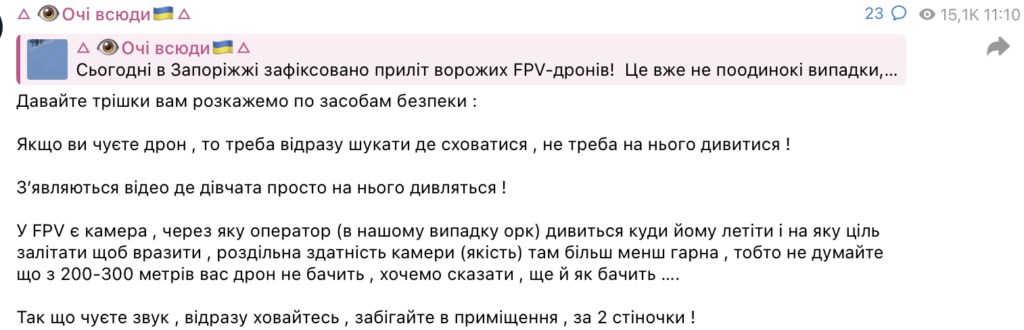 Моніторинговий канал «Очі всюди» після повідомлень про прильоти FPV у Запоріжжі нагадав базові правила безпеки. Автори підкреслюють: головне — не витрачати час на спостереження чи зйомку дрона, а одразу діяти.