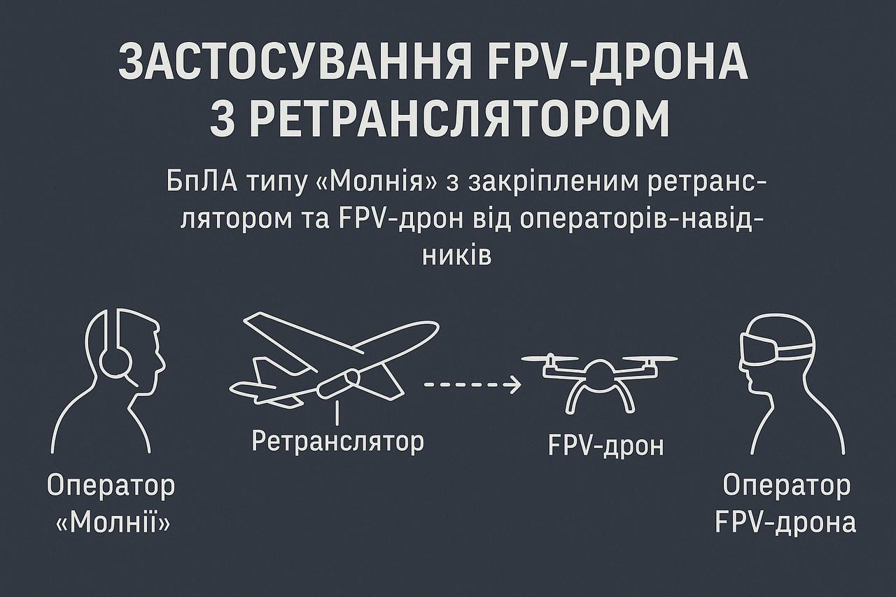 БпЛА «Молнія» — це так звана «матка». На ній встановлений ретранслятор (щоб тримати сигнал) і закріплений FPV-дрон.