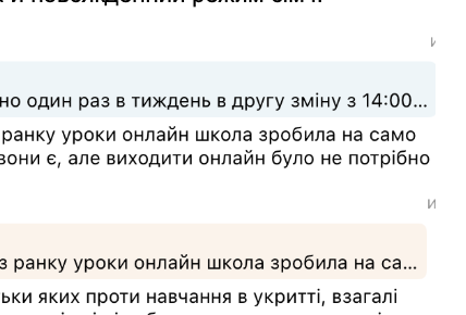 «У мене донька навчається у третьому класі, школа на Космосі. Я просто в шоці від організації процесу. У період війни все мало б бути спрощено, а в нас навпаки – купа додаткових складнощів. Спочатку обіцяли, що діти щодня відвідуватимуть по чотири уроки, а п’ятий проходитиме онлайн. Тепер оголосили змішане навчання. А ще й карантини починаються через COVID… Як у таких умовах планувати свою роботу? Ціла купа цих шкільних чатів, але домашнє завдання дитині доводиться повідомляти й пересилати мені, хоча вона вже може робити все сама. На другому тижні ми ще вирішували, чим користуватись – Zoom чи Google Meet. Дитина ніби самостійна, але виходить так, що я постійно маю бути поруч. Може, це лише у нашій школі так, а в інших легше?» – розповідає Олена.