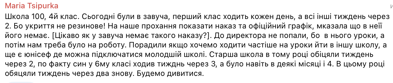 Батьки зазначають, що на початку навчального року у багатьох школах адміністрація запевняла: заняття проходитимуть щодня. Проте вже за кілька тижнів після старту почали запроваджувати змішаний графік – тиждень через два, а подекуди навіть із більшими перервами.
