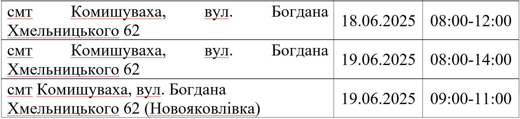 - смт Комишуваха, вул. Богдана Хмельницького, 62 (с. Новояковлівка) — 19 червня 2025 року, з 09:00 до 11:00