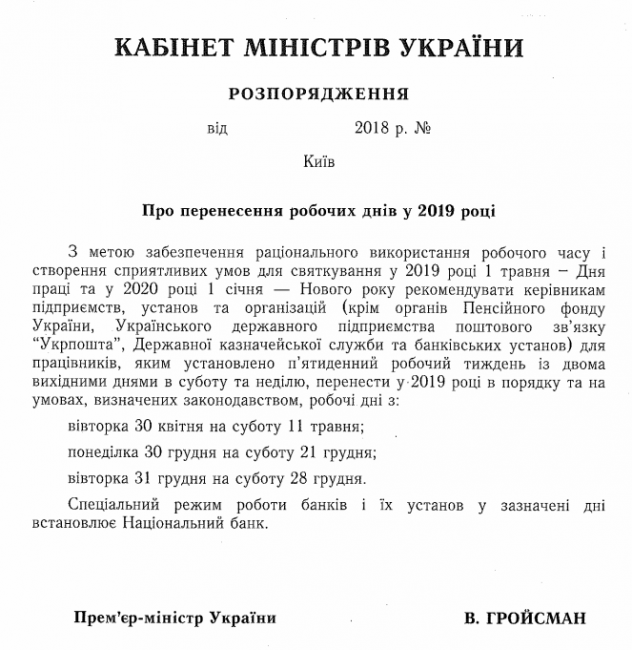 В правительстве определили график выходных для жителей Украины на праздники 2019.