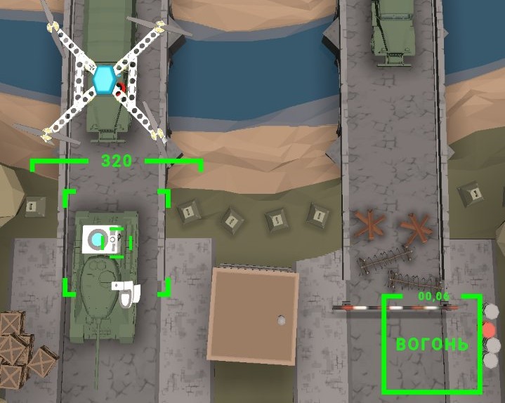 Натиснувши на кнопку далі, гравця переносить у гру. Ціль – знищити як умога більше ворожої техніки та отримати 10000 очок для відкриття нового безпілотника. Принцип гри простий: треба навести дрон на техніку противника, яка рухається колонами, та натиснути на клавішу “Вогонь”, після чого на транспорт зкидається боєприпас. Після завершення гри публікується результат гравця.