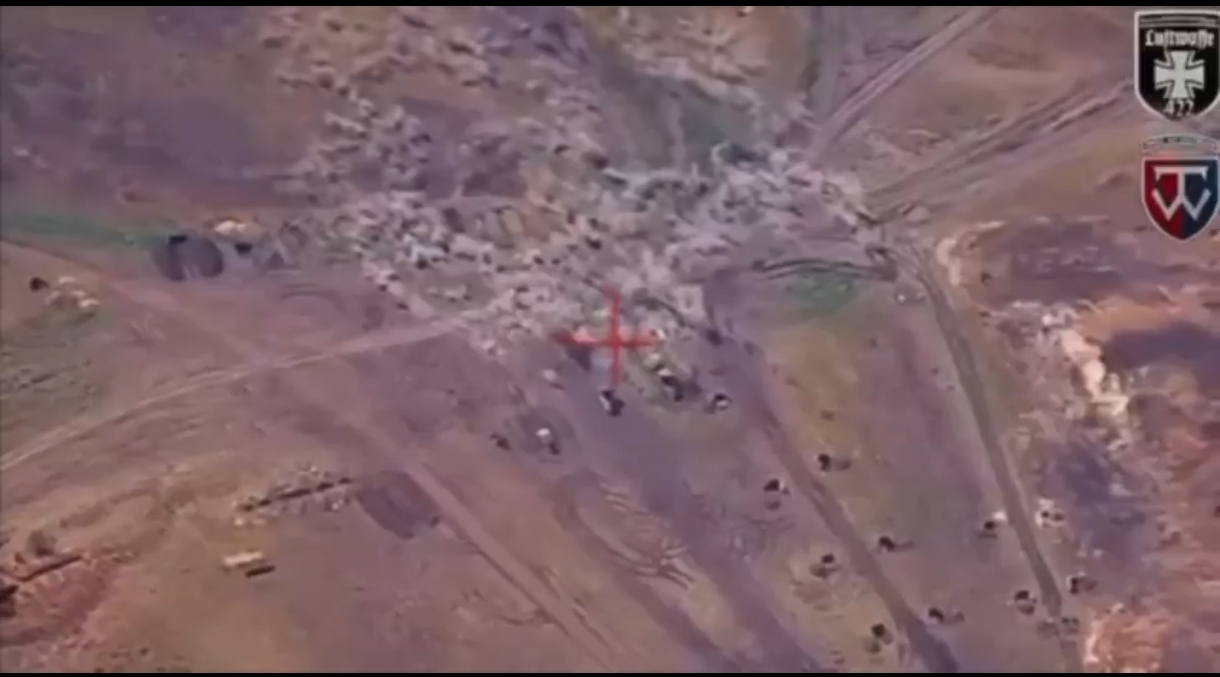 Як можна побачити, удар наноситься ракетою з касетною бойовою частиною. На полігоні можна побачити військову техніки, а також інженерні споруди, що використовуються для тренування військових.