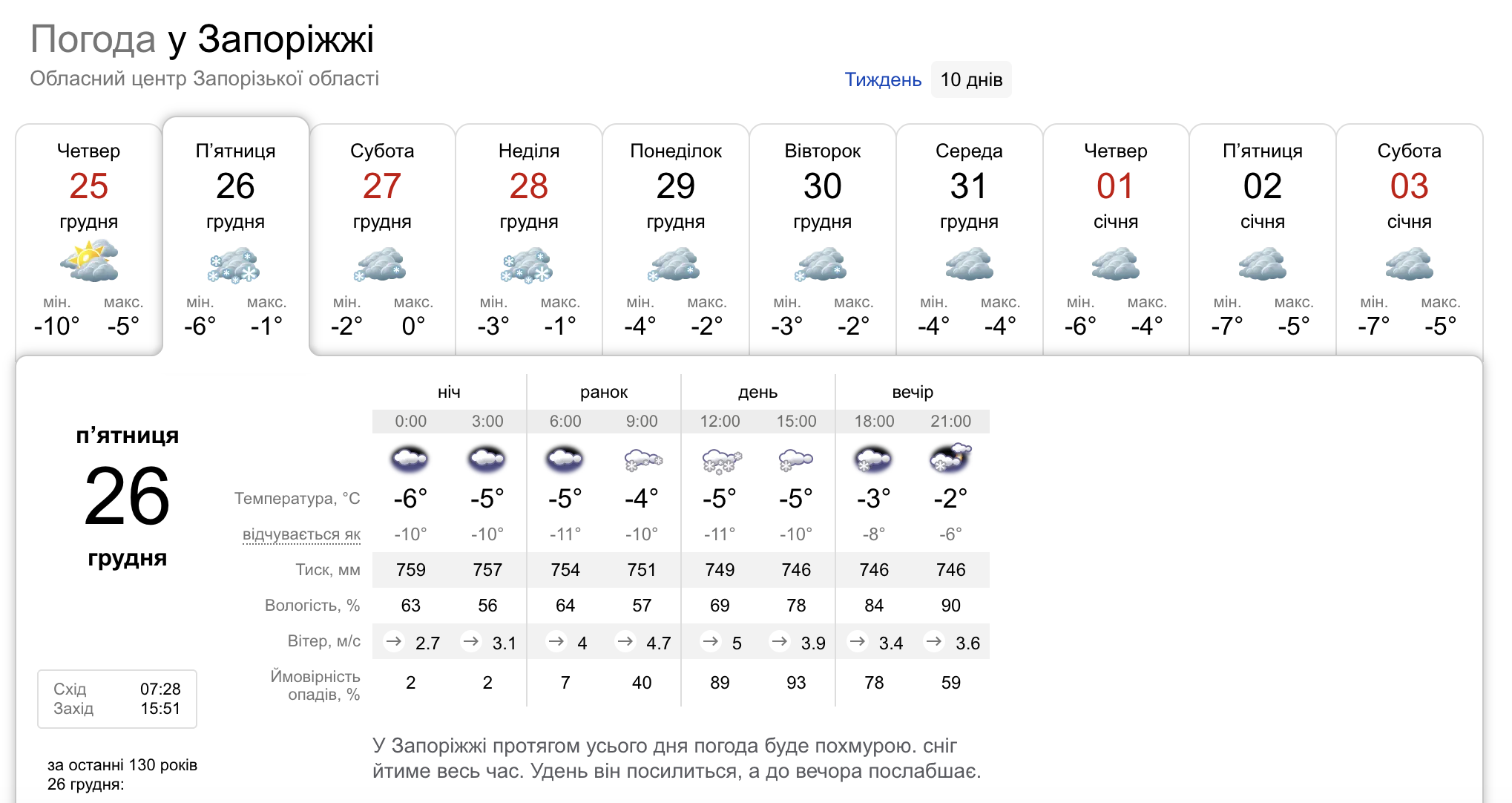 У Запоріжжі з п’ятниці, 26 грудня, починається період стійкої зимової погоди зі снігом і мінусовими температурами. За прогнозами синоптиків, місто входить у фазу тривалого похолодання, яке триватиме щонайменше до перших чисел січня.