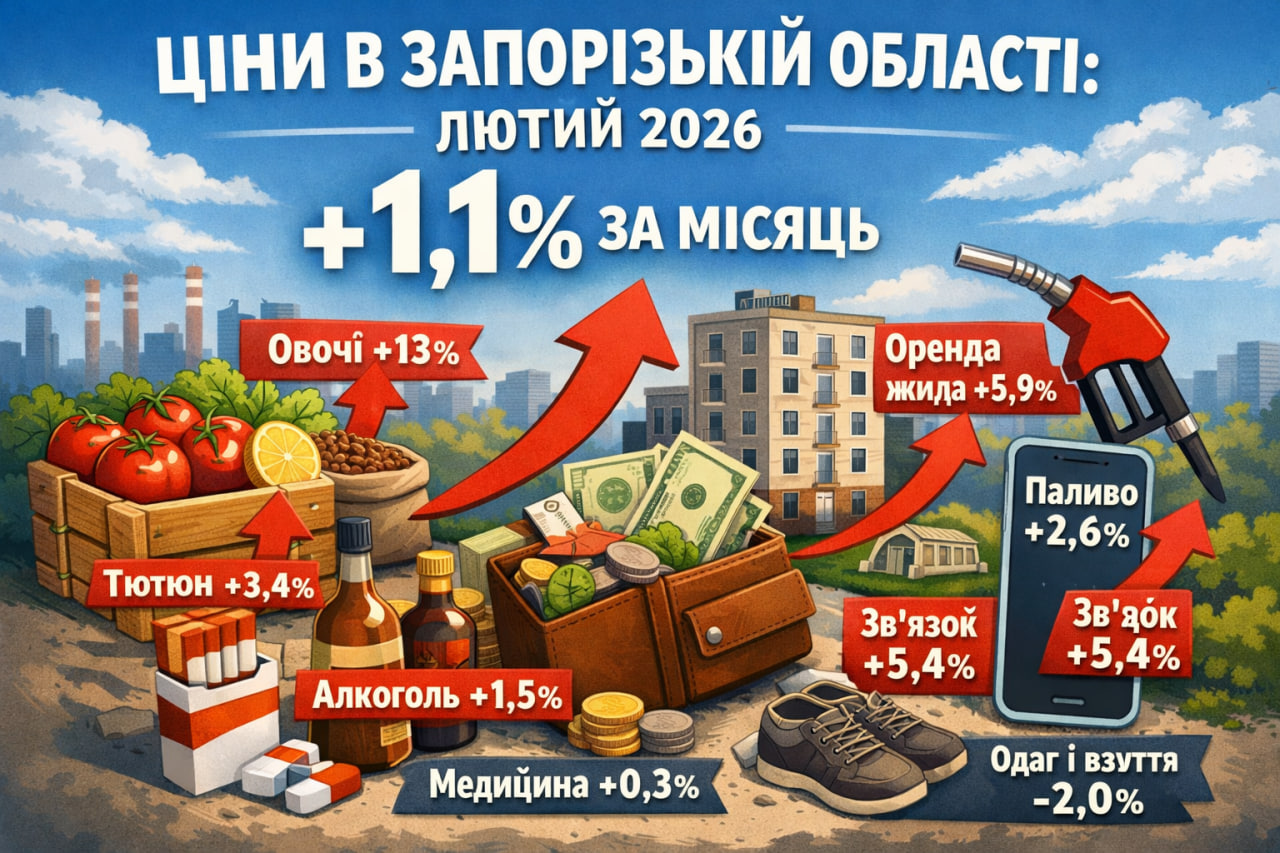 У лютому 2026 року споживчі ціни у Запорізькій області зросли на 1,1% порівняно з січнем. З початку року інфляція склала 1,3%, що трохи менше загальноукраїнського показника — 1,7%. Найбільше подорожчали овочі, тютюнові вироби та послуги зв’язку.