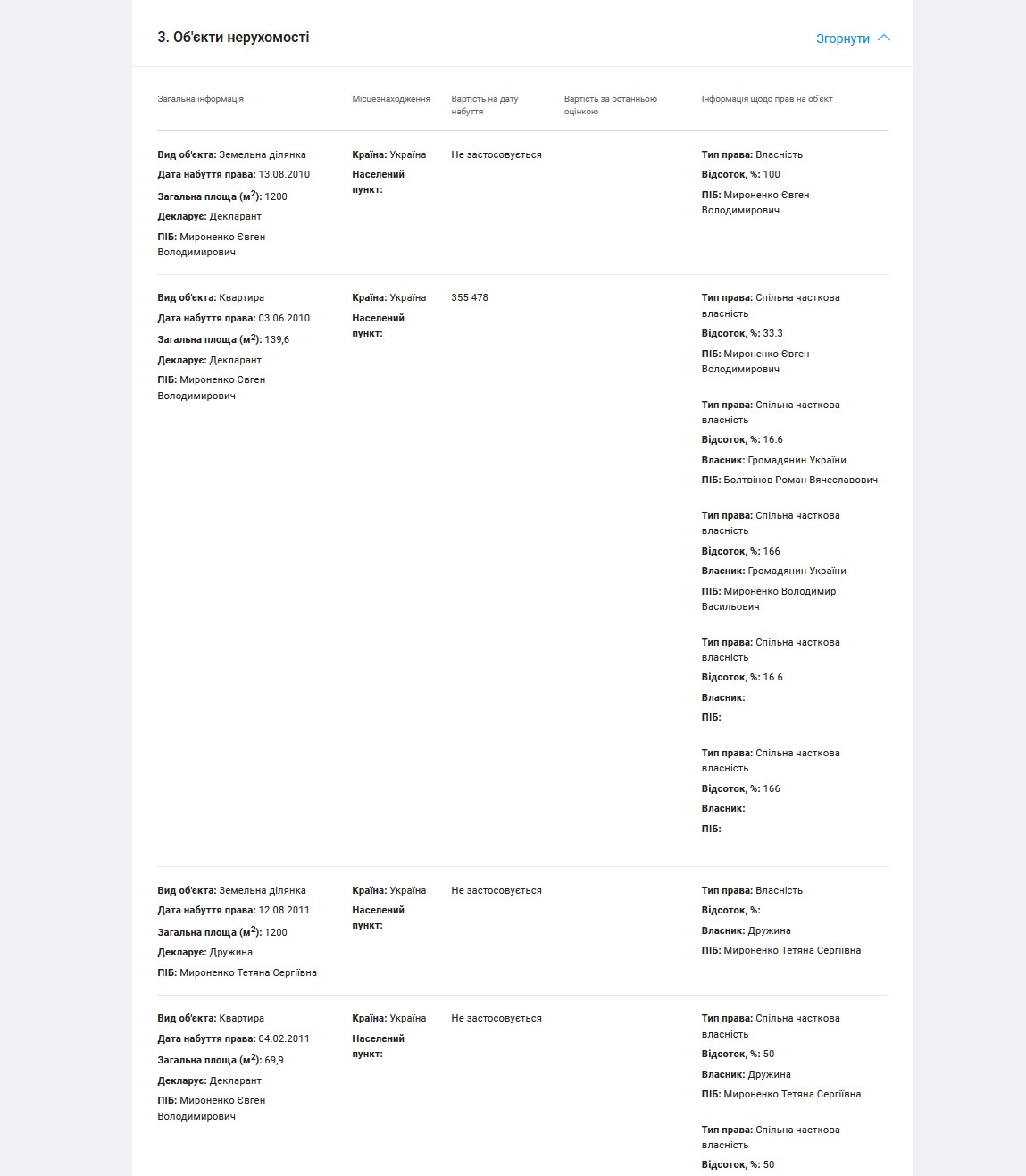 Другий об’єкт – квартира площею 139,6 кв. м, набуття якої датоване червнем того ж року. Частка Мироненка у цій квартирі становить 33,3%. Іншими співвласниками значаться Роман Болтвінов (16,6%), Володимир Мироненко (16,6%) та ще двоє осіб, прізвища яких у документі не вказані.
