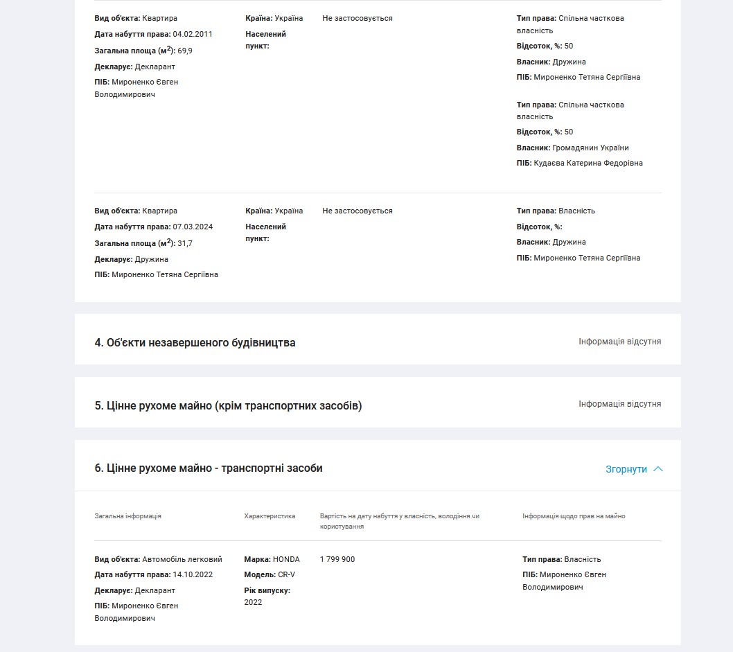 Четвертий об’єкт – квартира площею 31,7 кв. м, яка з’явилася у декларації лише у 2024 році. Її власницею є дружина декларанта. Ще один об’єкт – земельна ділянка площею 1200 кв. м, набуття права на яку датовано серпнем 2011 року, також належить Тетяні Мироненко. Усі об’єкти розташовані на території України. Вартість частини майна вказана лише частково: для квартири 139,6 кв. м зазначено суму 355 478 (ймовірно, гривень) на дату набуття.