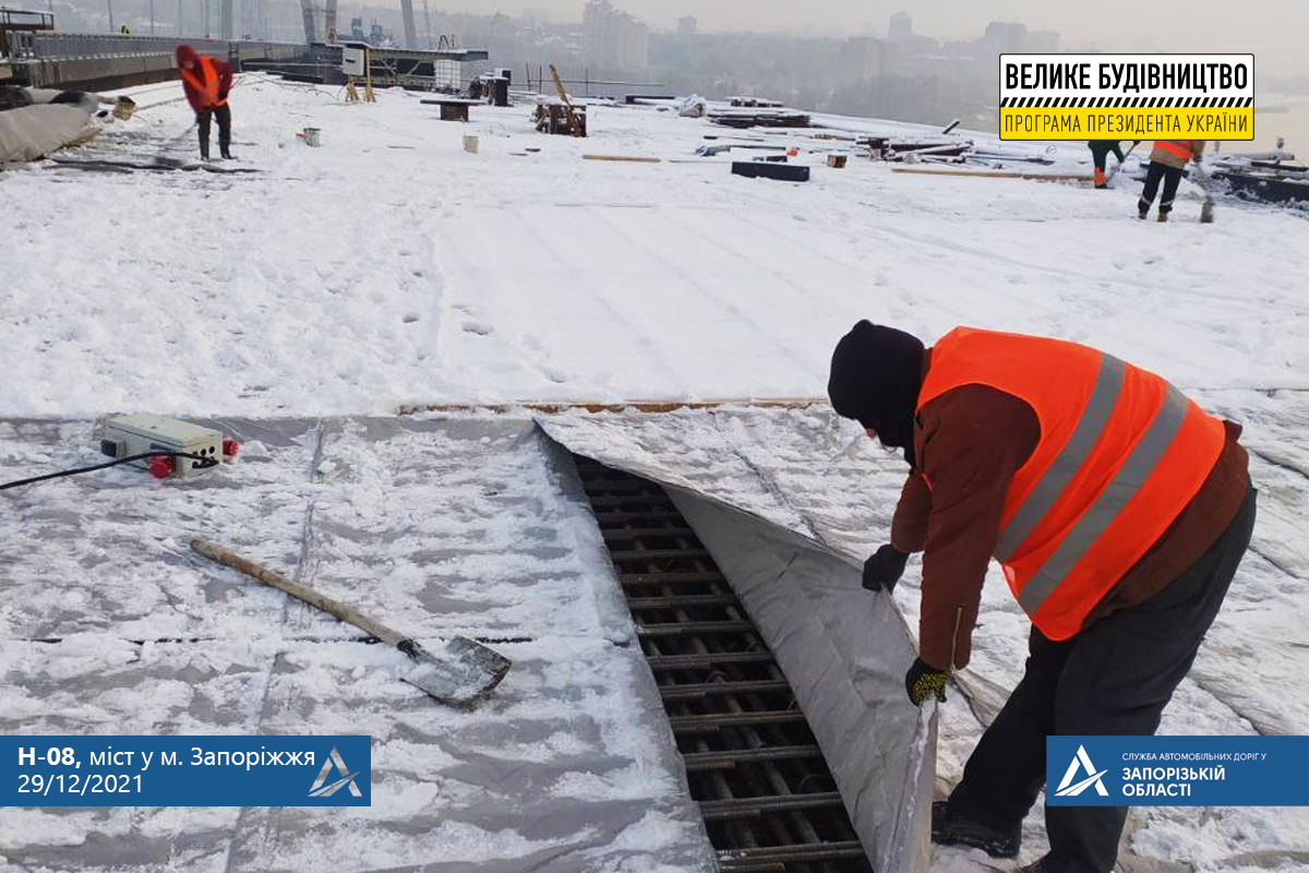 В Запорожье продолжаются работы на вантовом мосту, несмотря на мороз, снег и гололед.