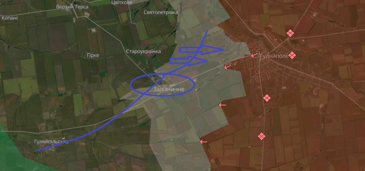 За словами OSINT-дослідника Thorkill, бойова обстановка в районі села Залізничне на захід від Гуляйполя значно складніша, ніж її показують популярні карти фронту.