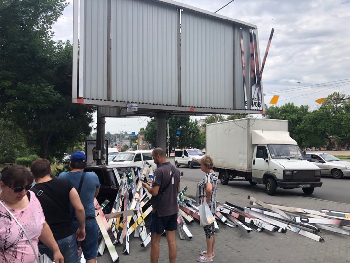 Происшествие произошло днем, 25 июня, на проспекте Соборном. Как сообщает “Форпост” со ссылкой на очевидцев, рекламную конструкцию зацепил грузовой автомобиль, вледствие чего билборд “осыпался” на землю.