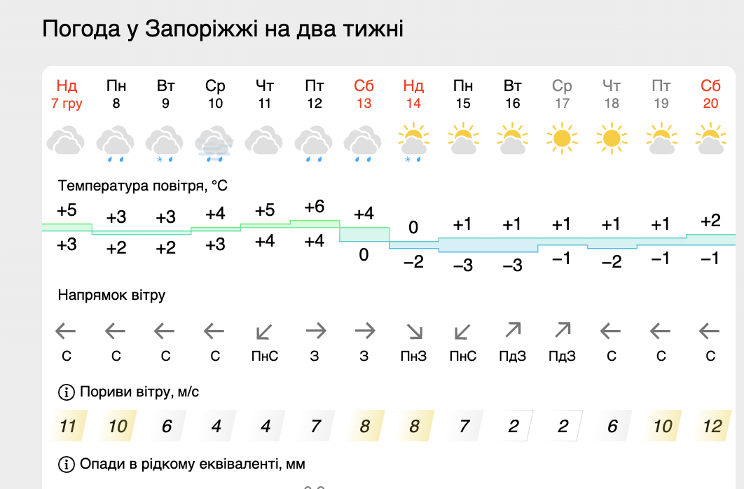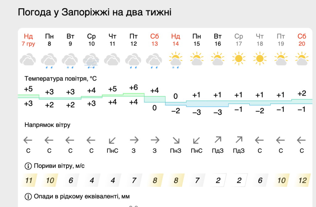 У Запоріжжі вже з наступного тижня відчутно похолодає. Згідно з актуальним двотижневим прогнозом, перші справжні мінуси в місті очікуються вже з 11–12 грудня, коли нічна температура впаде до 0…–2°C.