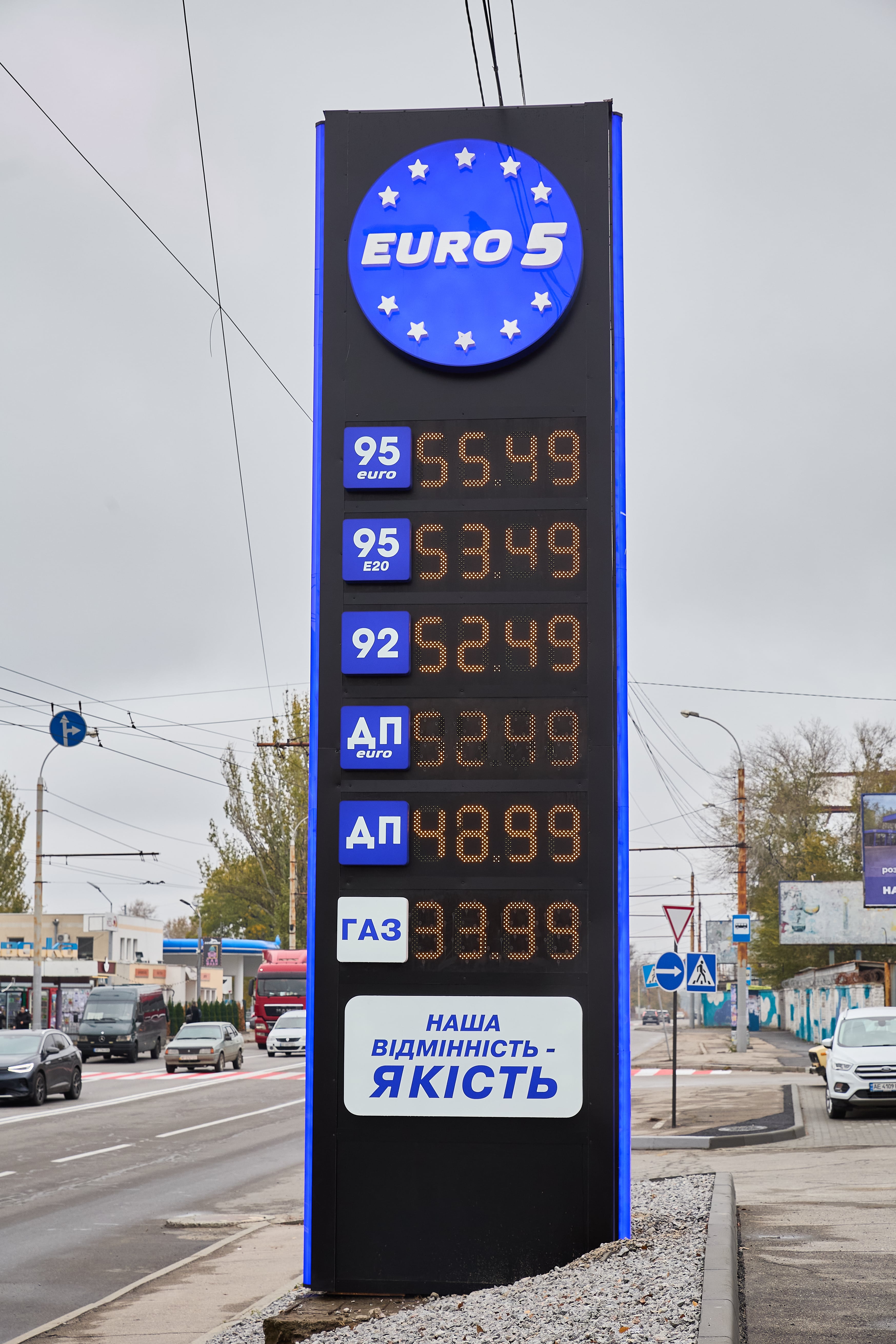 Це вже третя АЗС мережі EURO 5 на Правому березі міста. Зручне місце розташування біля великої транспортної розв’язки дає змогу водіям комфортно заправляти автівки пальним європейських стандартів, зокрема газом, бензином і дизелем.