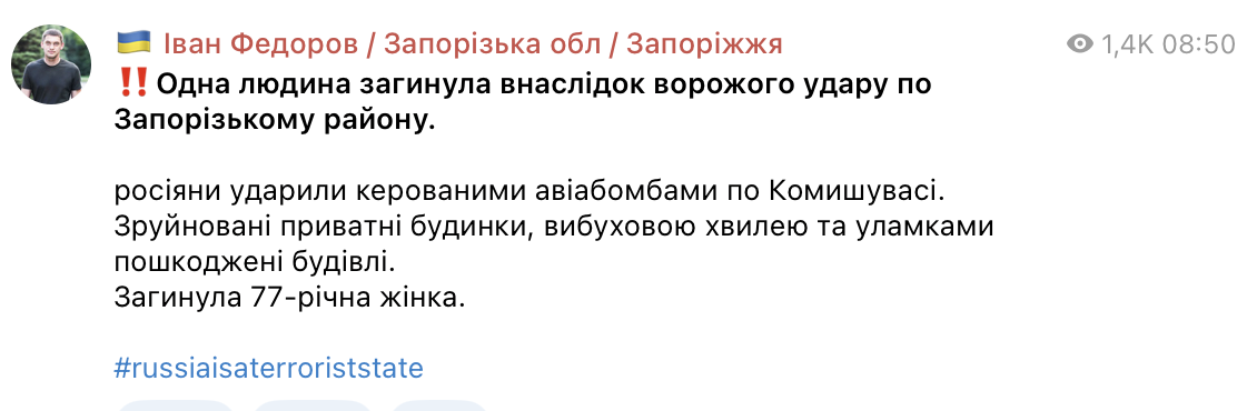 У Запорізькому районі внаслідок чергової російської атаки загинула мирна жителька. Під удар потрапила Комишуваха, куди окупанти спрямували керовані авіабомби.