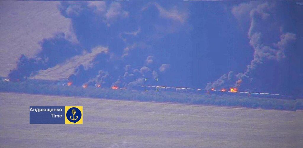 Ворожий потяг зійшов із рейок і наразі піддається додатковим ураженням із застосуванням безпілотних літальних апаратів. Через це виникла сильна пожежа, яка добре помітна здалеку.