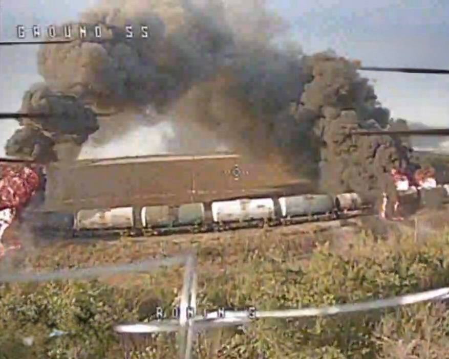 Потяг зйшов з рейок і зараз його добивають всім, що може літати. Палає красиво.