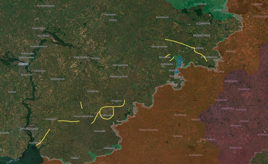 Ворожі сили наближаються до м. Гуляйполя вже з північного сходу. Довгий час ЗСУ вдавалося стримувати ворога з півдня, зокрема із району Марфопіль. Але це було можливо в тому числі завдяки налагодженій логістиці, зокрема по рокадній трасі Гуляйполе – Покровське. Проте вже як місяць вона під постійним тиском FPV-дронів. Незрозуміло чому, але вона не була вчасно, на початку літа, обладнана в достатній мірі антидроновими сітками. До Гуляйполя ще є шляхи постачання, але вони також під ударами, або це грунтові дороги, які зараз малопрохідні.