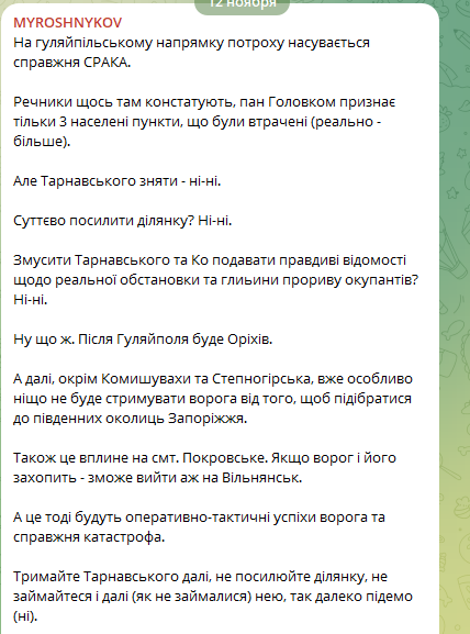 Гуляйпільський напрямок: На цій ділянці ситуація розсипається буквально на очах. Лінія оборони не витримує натиску, фронт просідає щодня і якщо так піде далі, ворог неминуче дійде до самого Гуляйполя. Причина — не у нестачі мужності наших бійців, а у повному провалі керівництва на місцях. Пани, які відповідають за цей рубіж, втратили контроль і боєздатність підрозділів. Комунікація між частинами фактично зруйнована, координація глуха як вітер, дії не узгоджені, накази або запізнюються, або взагалі не доходять. У штабних доповідях лише показуха і звіти для галочки, замість реальної оцінки обстановки. Через це на місцях вмникає тотальний п#здець: солдати лишаються без підтримки, без нормальної ротації, без тилового забезпечення. Фактично, тут все тримається лише на тих, хто залишився стояти до талого без чітких вказівок і без плану. Я вважаю, що настав час, щоб вище командування прибуло безпосередньо на місце, побачило все на власні очі й розібралося, хто довів ситуацію до цього стану. Якщо не буде наведено порядок і не знімуть тих, хто провалює управління–фронт остаточно посиплеться. Тут уже не про дисципліну йдеться, а про виживання цілого напрямку.