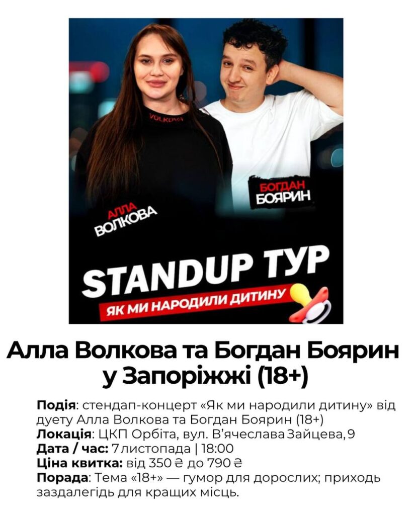Відомі коміки Анна Волкова та Богдан Боярин виступатимуть у Запоріжжі на цих вихідних. Вхід лише для тих, хто має 18 років. Анонсовано дорослий гумор, вартість квитків від 350 гривень.