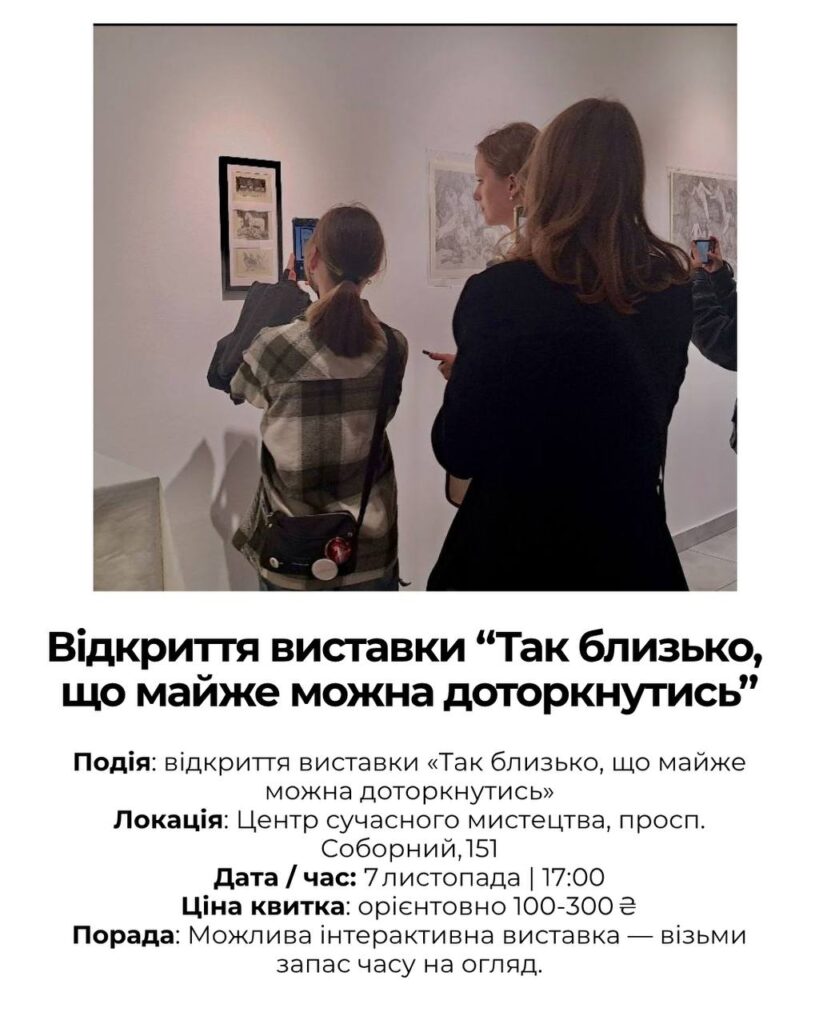 На вихідних заплановане відкриття виставки “Так близько, що майже можна доторкнутися” у центрі сучасного мистецтва в Запоріжжі.