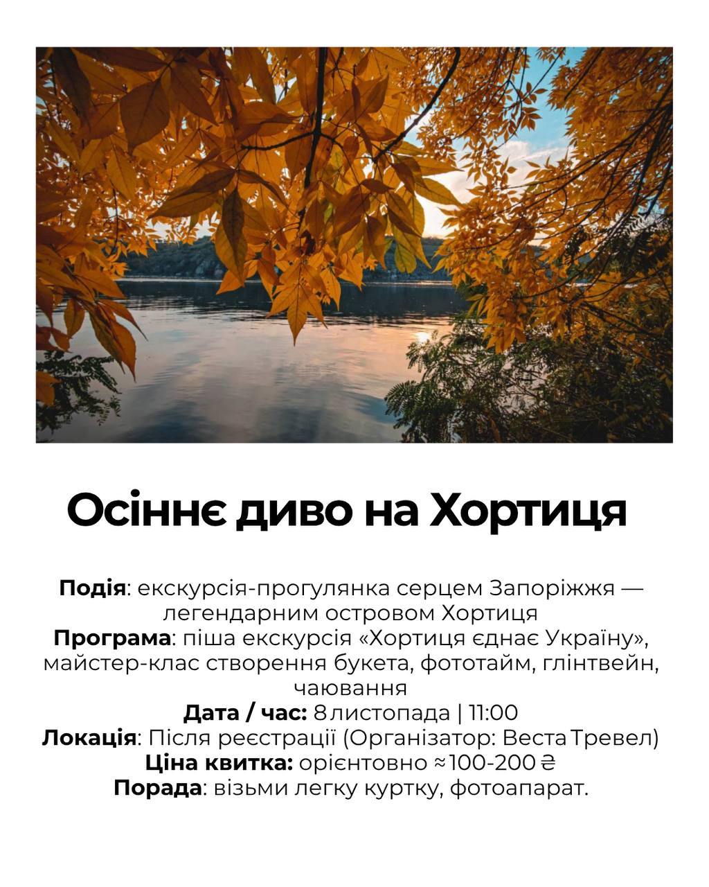 Компанія Веста-тревел організовує пішу екскурсію на Хортиці. Учасники також зможуть створити букет із листя під час майстер-класу, а також насолодитися глінтвейном.
