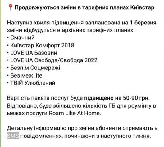 Оператор планує інформувати користувачів персонально — через службові SMS із деталями щодо оновленої абонплати та переліку включених послуг. Розсилка повідомлень очікується найближчими днями, щоб клієнти мали час оцінити зміни та, за потреби, обрати інший тариф.