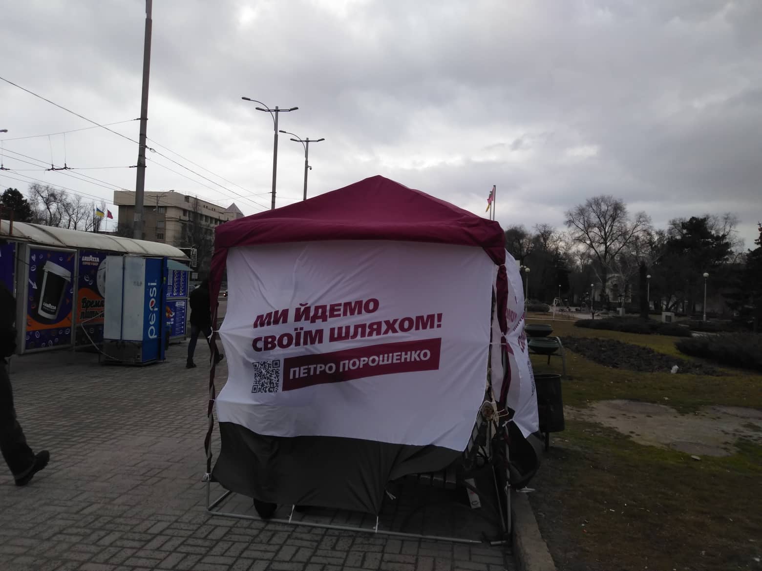 Сегодня, 1 марта, в центре Запорожья прямо напротив мэрии, на ост. б. Шевченко агитаторы Петра Порошенко установили палатку на общественную лавочку.