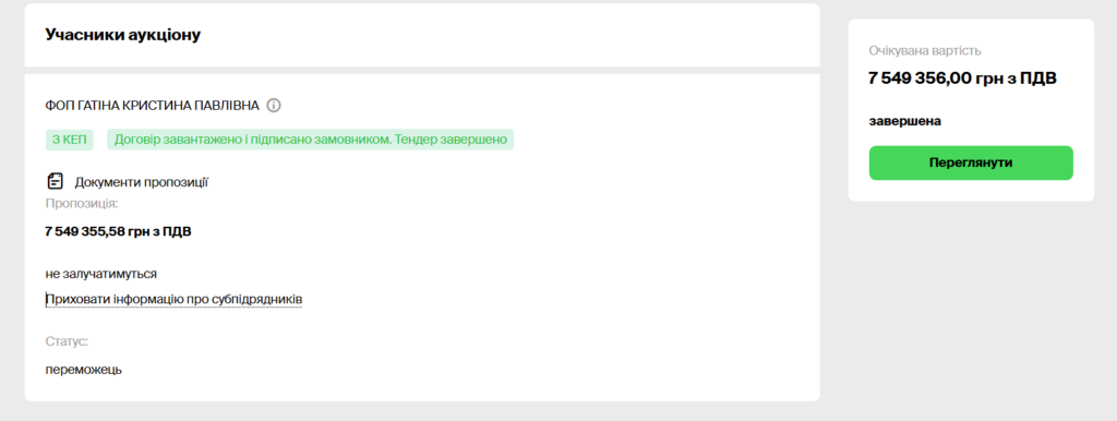 Переможцем тендеру стала ФОП Кристина Гатіна. Вона була єдиним учасником торгів і запропонувала вартість робіт понад 7,5 мільйона гривень.