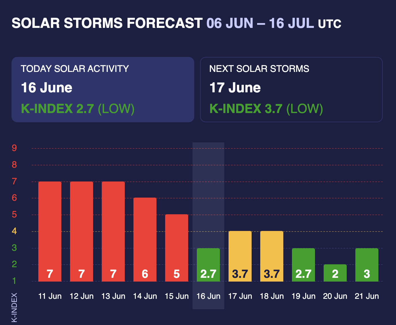 Для тих, хто слідкує за космічною погодою щодня, актуальна інформація на 16 червня виглядає втішно: бурі слабкі, суттєвого впливу на здоров’я або техніку не прогнозується. Проте ситуація змінна, адже дані оновлюються щонайменше тричі на добу.
