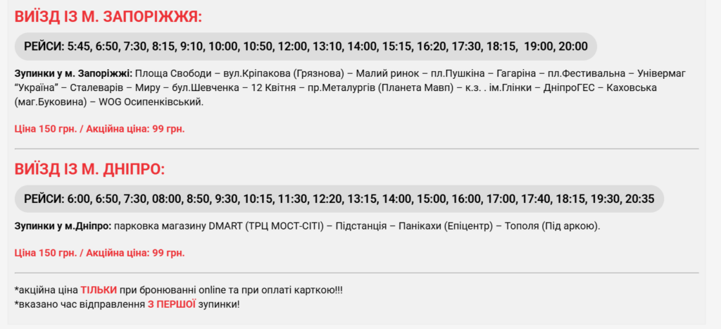 Зазначимо, що маршрутка Запоріжжя-Дніпро має зазвичай стандартний маршрут – центральний автовокзал у Запоріжжі – автовокзал у Дніпрі. Однак деякі перевізники також пропонують прибуття на залізничний вокзал у Дніпрі, зупинка “Панікахи” або Мост-сіті.
