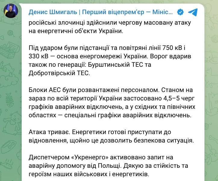Також диспетчером НЕК «Укренерго» активовано запит на аварійну допомогу від Польщі, щоб підтримати стабільність української енергосистеми в критичний момент.