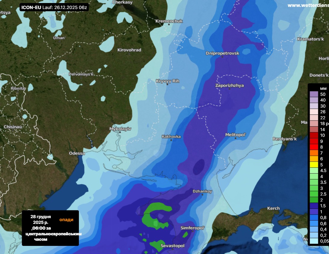 Так, у вихідні дні 27-28 грудня погодні умови визначатиме активна циклонічна діяльність. Очікується випадіння помірного снігу й мокрого снігу, налипання мокрого снігу, на дорогах ожеледиця.