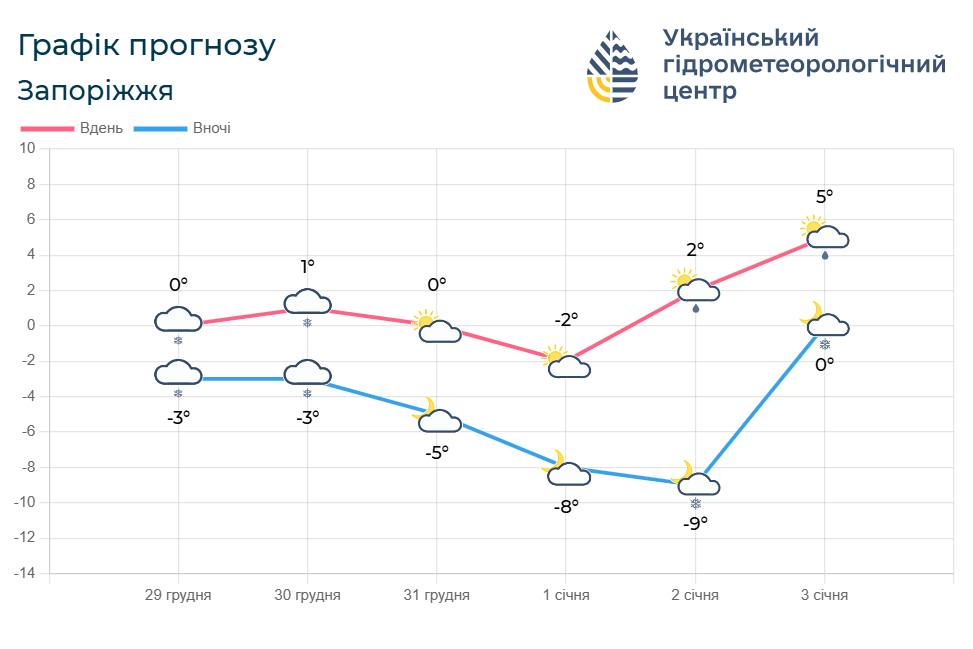 За попереднім прогнозом, у Запоріжжі триматиметься “мінусова” температура до 2 січня включно. Найбільш холодні дні — 1 і 2 січня (до -9 градусів Цельсія вночі і до -4 градусів вдень). З 3 січня очікується потепління до +3 градусів Цельсія вдень.
