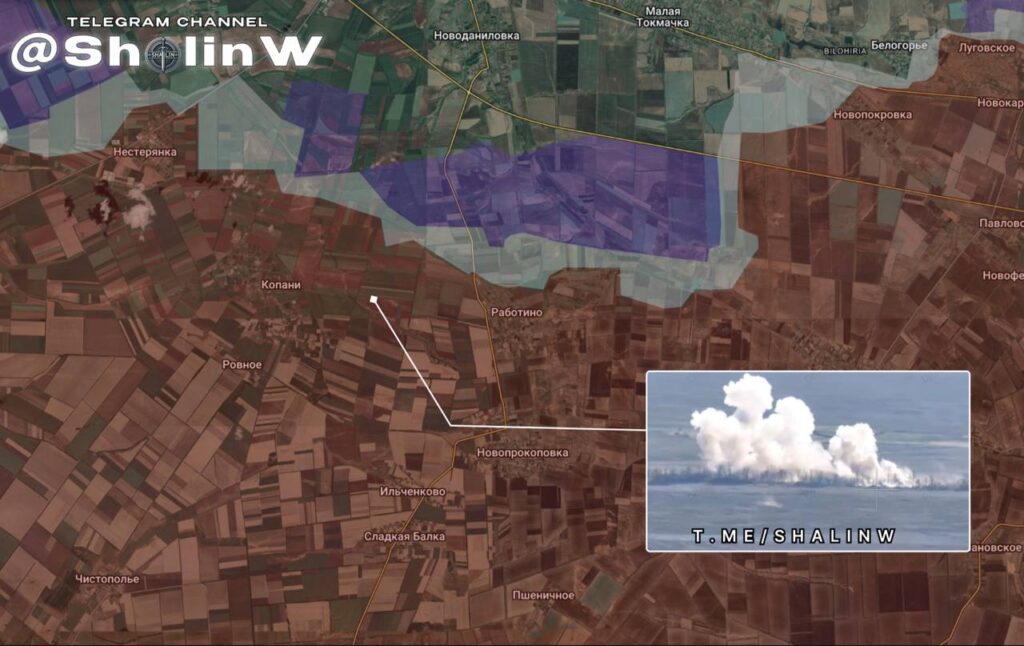 Осінтером SHALIN визначено, що удар було нанесено в районі н.п. Копані та Роботине, що під Оріховом. Там росіяни регулярно накопичуються для подальших штурмів у напрямку Новоданилівки. Зокрема, нещодавно МіГ-29 розніс залишки будівлі школи у Роботиному, де накопичувалися кадирівців.